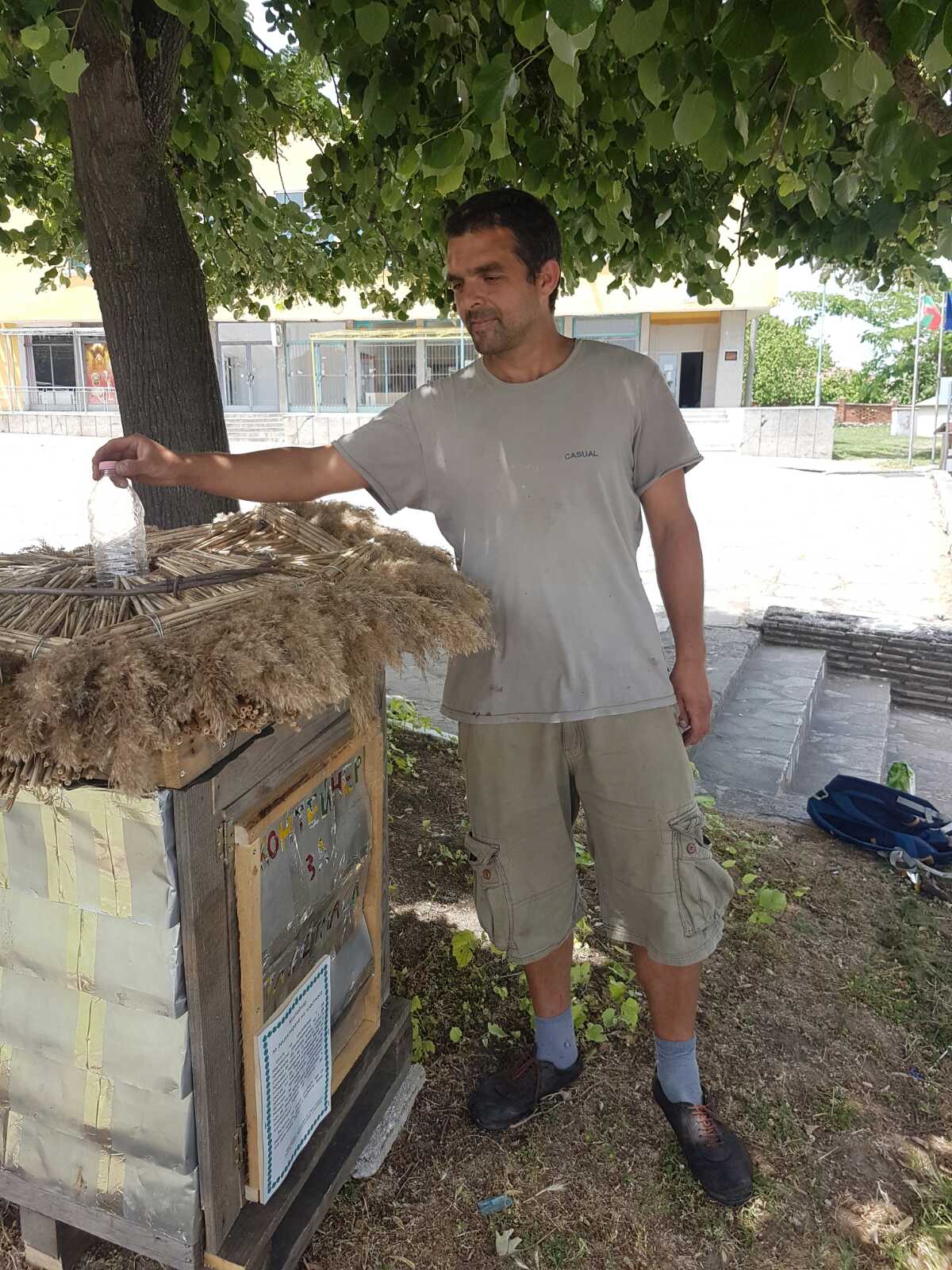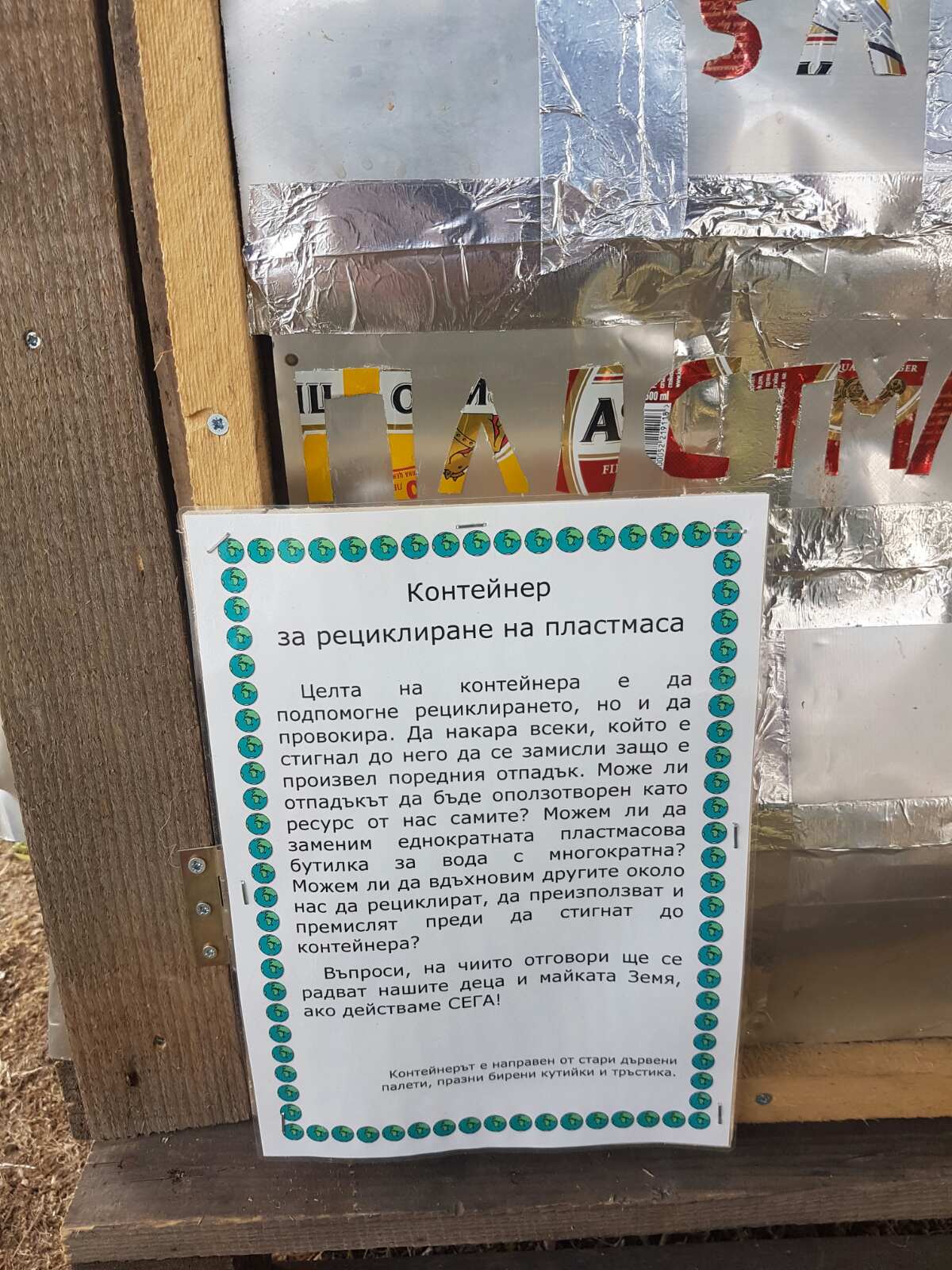 Контейнерите са изработени от стари палети, празни бирени кутии и тръстика. На тях е поставен надпис, който обяснява, че идеята е да се подпомогне рециклирането на отпадъци, както и да се предизвикат хората да се замислят могат ли да произвеждат по-малко отпадъци, могат ли да оставят на децата си една по-чиста планета.