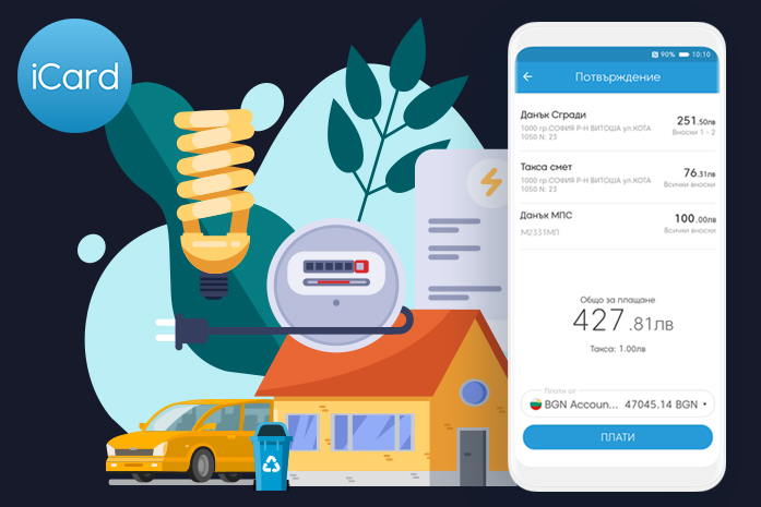 Плащането на битови сметки, данъци и такси чрез iCard може да бъде извършено по всяко време на денонощието и независимо от местоположението на клиента по света, стига той да има достъп до интернет. Трансакцията се отчита автоматично от общината или от доставчика на съответните битови услуги. Няма такса за плащане на сметки за вода, ток, телефон, парно, интернет, телевизия и т.н. Таксата за плащане на местен данък или такса е минимална – 0,50 лв.
