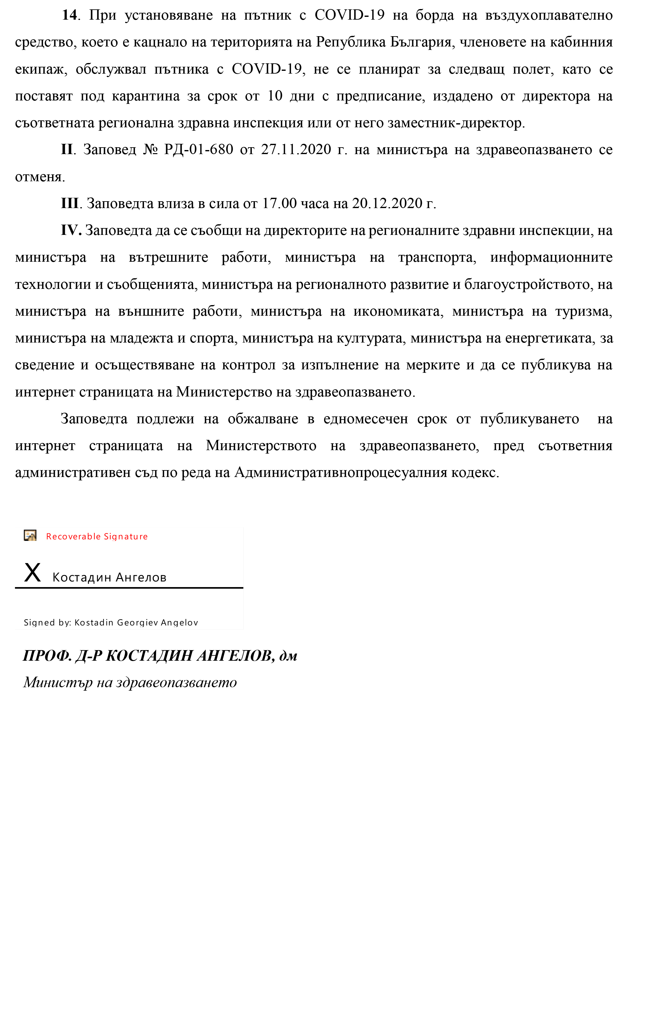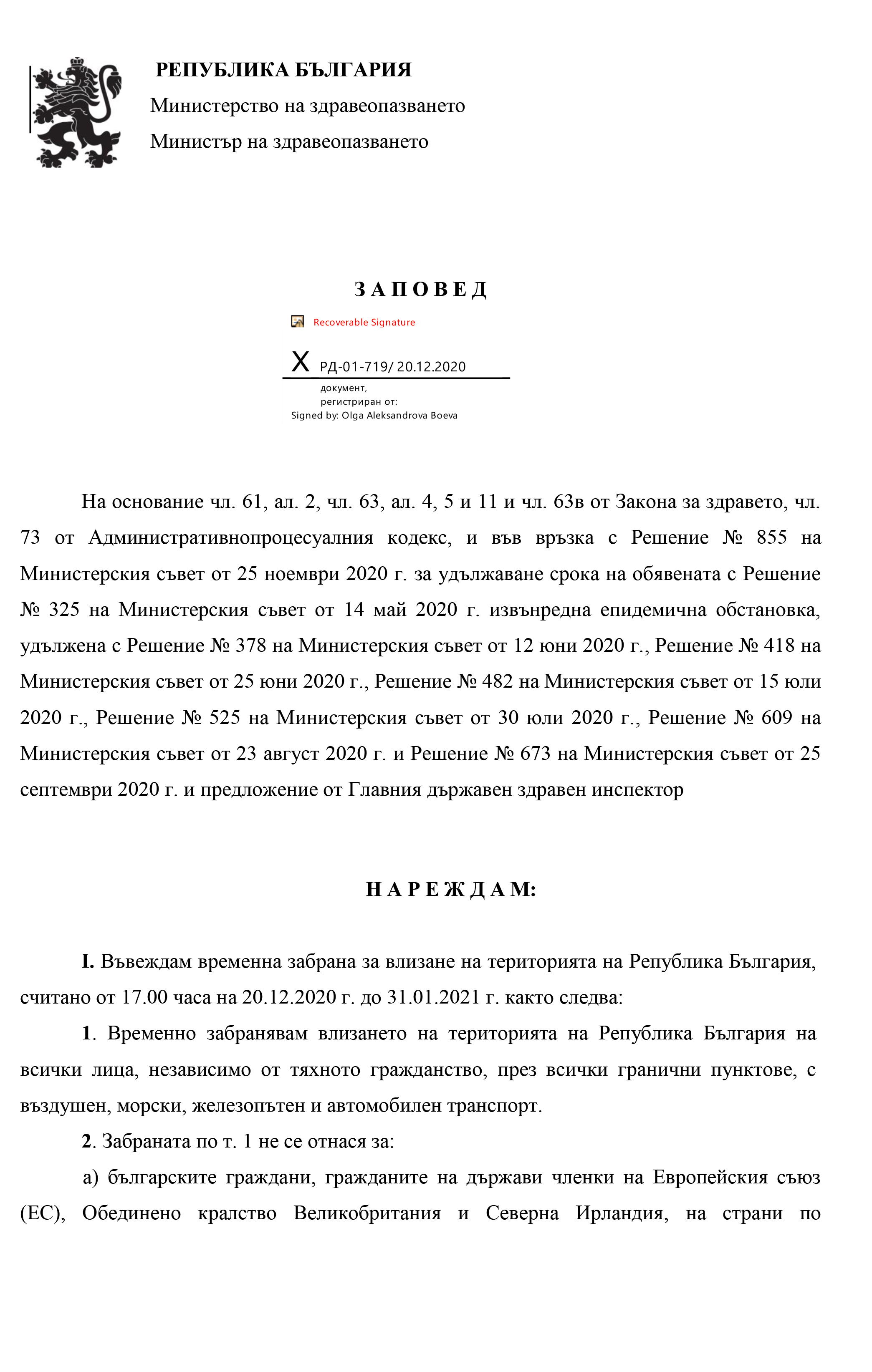 Заповед № РД-01-719/20.12.2020 влиза в сила от 17.00 часа на 20.12.2020 г.
