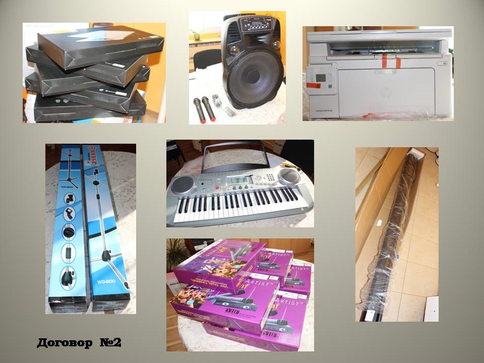 · За провеждане на празник „Вълшебница природа“ в ДГ „Зорница“ – принтер-1 бр., лаптоп-1 бр.· За провеждане на постановка „Разкажи ми приказка“ в ДГ „Слънце“ – мултимедиен екран-1 бр., лаптоп-1 бр.· За нуждите на музикално ателие в ДГ „Детелина“ – лаптоп – 1 бр., малък синтезатор за разпяване на децата-1 бр.; · За провеждане на празник „Пролетна китка“ в ДГ „Радост“ – преносима тонколона за озвучаване-1 бр.; · За провеждане на празник „Народни празници и обичаи“ в ДГ „Снежанка“ – безжичен микрофон-5 бр., стойка за микрофон-2 бр.; · За занимания по танци по Д8 с ръководител Людмила Спатару – озвучителна уредба/тонколона-1 бр., · За обособяването на „Мултифункционална стая“ в ДГ „Детелина“ – лаптоп-1 бр.