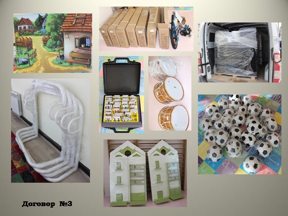 В изпълнение на Договор № 3 са доставени:· За нуждите на Арт ателие „Под дъгата“ в ДГ „Детелина“ – стативи-15 бр., бяла хартия-10 бр. пакети, цветна хартия-4 бр. пакети, бял картон-4 бр. пакети, цветен картон-4 бр. пакети, бял картон А5/скицник за рисуване-10 бр., тишу хартия опаковка-2 бр., черни моливи-15 бр., цветни моливи -1 кашон с 15 бр. комплекти, водни бои -1 кашон с 15 бр. комплекти, четки-30 бр., ножици-15 бр., ножици за декоративно рязане комплект-2 бр., декоративен перфоратор-10 бр., лепило-15 бр., пастели -1 кашон с 15 бр. комплекти, пластилин-1 кашон с 15 бр. комплекти, прежди и конци комплект различни видове-1 бр., платове комплект ралични видове-1 бр., гипс и глина комплект-1 бр., детска престилка-15 бр., печатни издания -1 бр. комплект от различни видове.· За провеждане на занимания по БДП в ДГ „Снежанка“ – пътни знаци-10 бр., образователна игра „Безопасност“-3 бр., подвижна площадка по БДП-2 бр. и светофар-2 бр. · За провеждане на занимания по БДП в ДГ „Слънце“ – комплект пътни знаци и светофар – 1 бр., боя за маркировка-3 бр. разфасовки, ударопоглъщаща настилка-117 кв.м. · За нуждите на театрално ателие „Приказни вълшебства“ в ДГ „Детелина” – параван за куклен театър-1 бр., меки кукли ръкавици за куклен театър/петрушка-10 бр., макети/макетно пано за декор-3 бр., материали за декори-1 комплект.· За провеждане на „Коледен празник“ в ДГ „Радост“ – коледни лампи/светещи маркучи-10 бр.; · За провеждане на постановка „Разкажи ми приказка“ в ДГ „Слънце“ – сценичен параван за представяне на куклен театър-2 бр.;· За провеждане на „Празник на буквите“ в ДГ „Радост“ – комплект магнитни букви-2 бр.· За провеждане на празник „Аз обичам българския език“ в ДГ „Снежанка“ – комплект магнитни букви-2 бр., обучаващ молив-40 бр., магнитна дъска мобилна-2 бр., макет на дърво-3 бр., макет на храст-3 бр., макет на ограда-4 бр., макет на замък-1 бр.; · За нуждите на музикално ателие в ДГ „Детелина“ – дискове с народни песни-10 бр., нотни тетрадки-50 бр., книги с текстове на народни песни-3 бр., комплекти ударни музикални инструменти-3 бр. комплекти, тъпан-1 бр.; · За провеждане на празник „Народни празници и обичаи“ в ДГ „Снежанка“ – тъпан-1 бр.; · За провеждане на празник „Фолклорни пролетни празници“ в ДГ „Слънце“ – тъпан-1 бр.; · За провеждане на спортен празник „Ние сме спортисти“ в ДГ „Радост“ – детски велосипеди-3 бр.; · За провеждане на празник „Весел спорт“ в ДГ „Снежанка“ – детски велосипеди-4 бр., спортен комплект „Масов спорт“-2 бр., корково табло-5 бр., информационно табло-2 бр.· За провеждането на демонстрационните турнири в седмицата на спорта за партньора ФК „Свиленград 1921“ – футболна топка №4-30 бр., футболна топка №5-20 бр., полутопка за баланс-2 бр., пръчка 100 см-20 бр., шапки за маркиране-100 бр., тренировъчен колан за огледална тренировка за двама-10 бр., колче за слалом-20 бр., чанта сак за топки-3 бр., рингове плоски-20 бр., тренировъчна стълба-4 бр., тренировъчни препятствия-10 бр., врата за мини футбол 0,80Х0,70 м-6 бр., врата за мини футбол 1,20Х0,80 м-4 бр., фигура манекен за преки свободни удари-5 бр., ластици за тренировка-20 бр.; · За провеждане на съвместен концерт по Д6 „Да пеем и танцуваме заедно“ – декори за сцена-10 бр.· За тренировки и подготовка на децата за седмицата на спорта за партньора ФК „Евророма“ – футболни топки-40 бр.; · За занимания по танци по Д8 с ръководител Людмила Спатару – чадъри-15 бр.; · За об