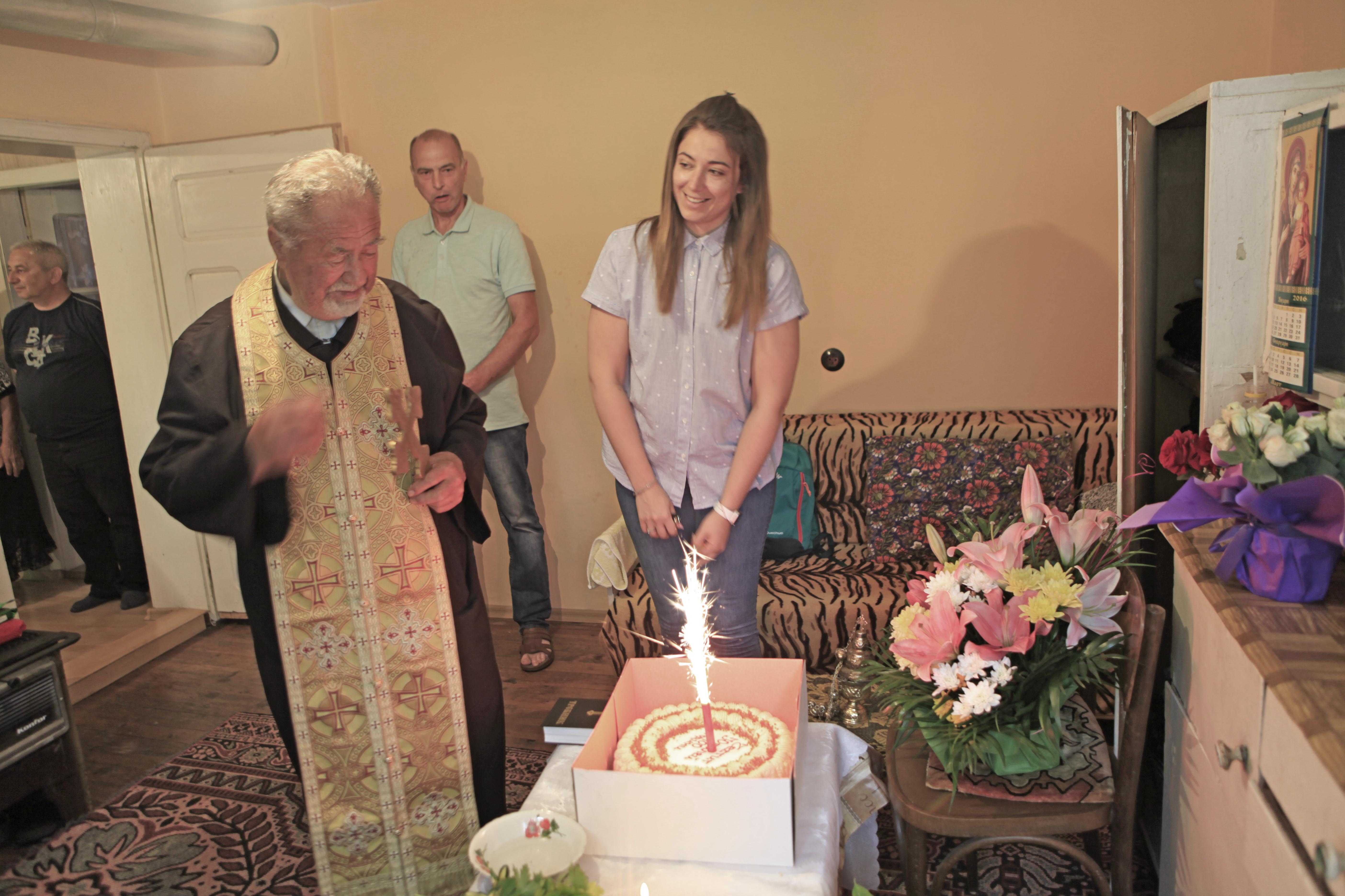 Църковното настоятелство подари икона на Света Дева Мария с пожелания за дълголетие, а отец Перчемлиев отслужи водосвет за здравето на юбилярката.