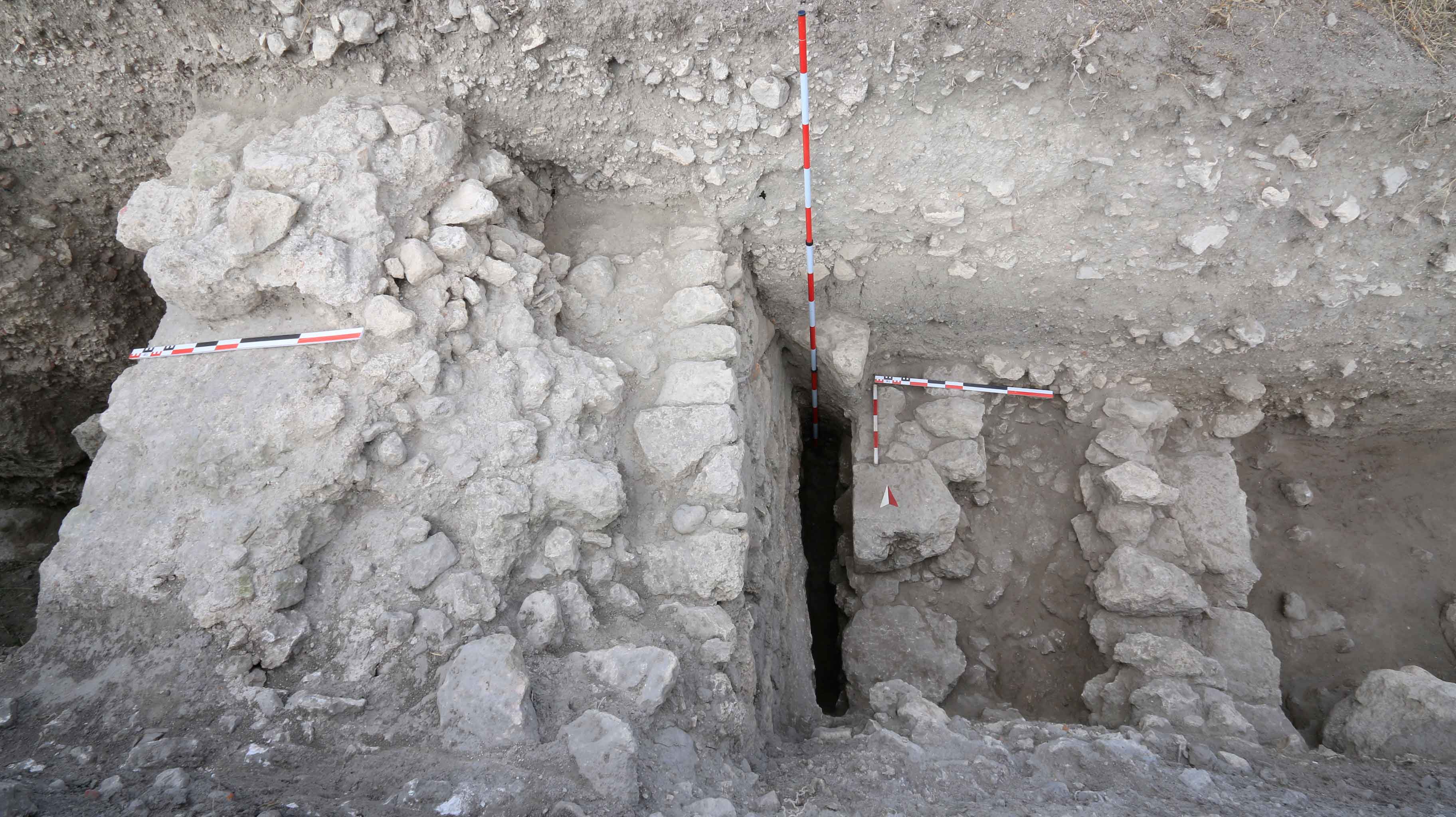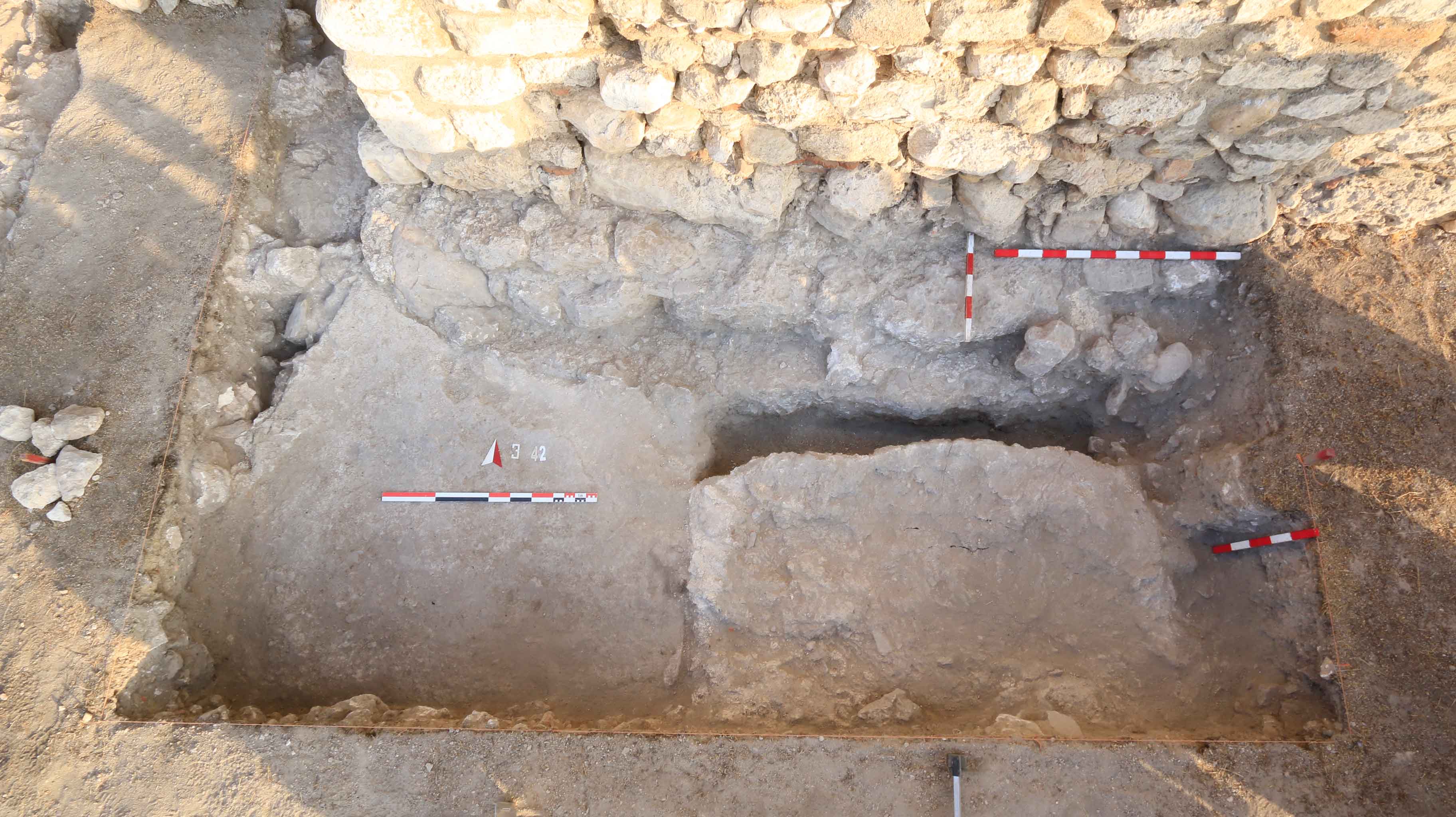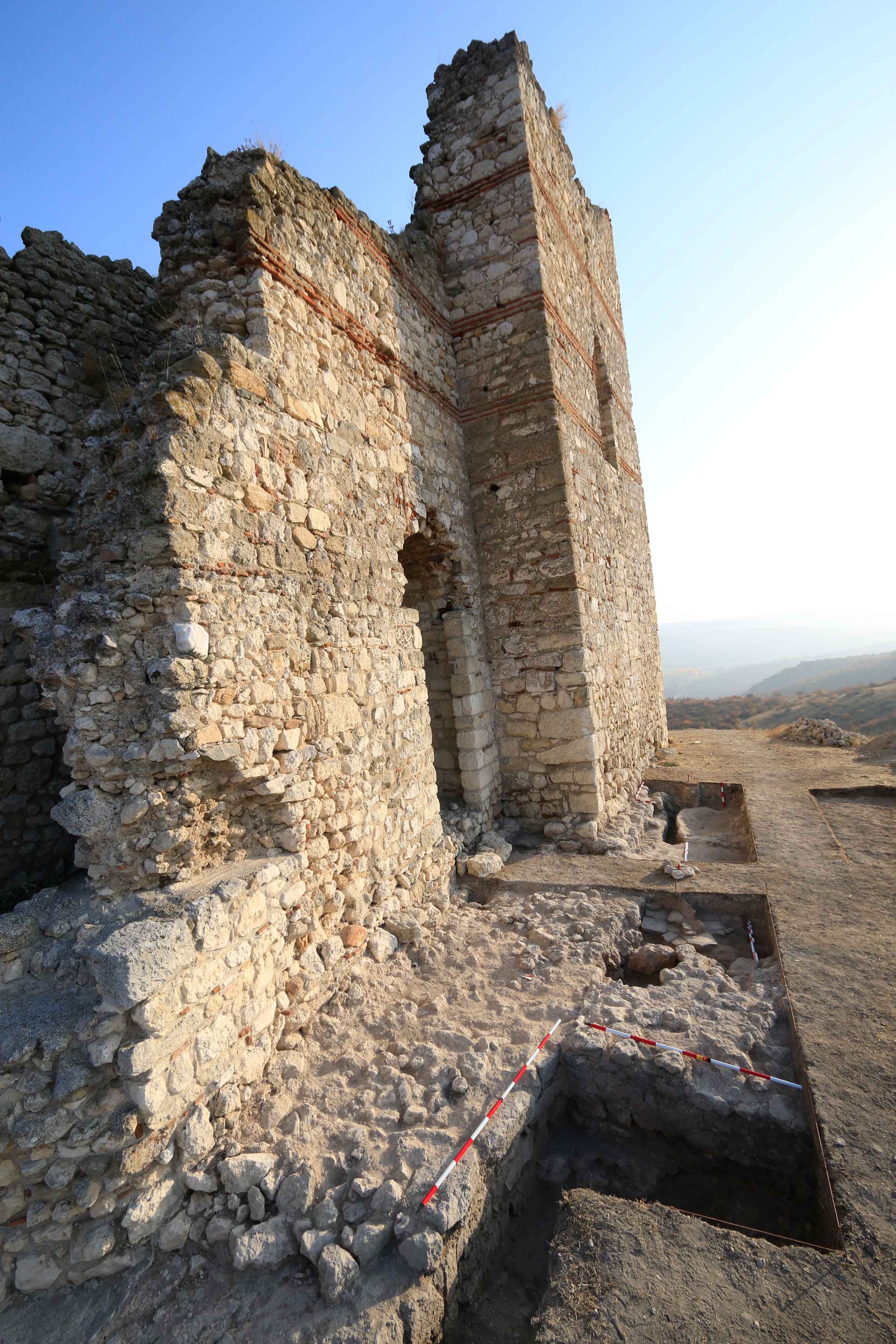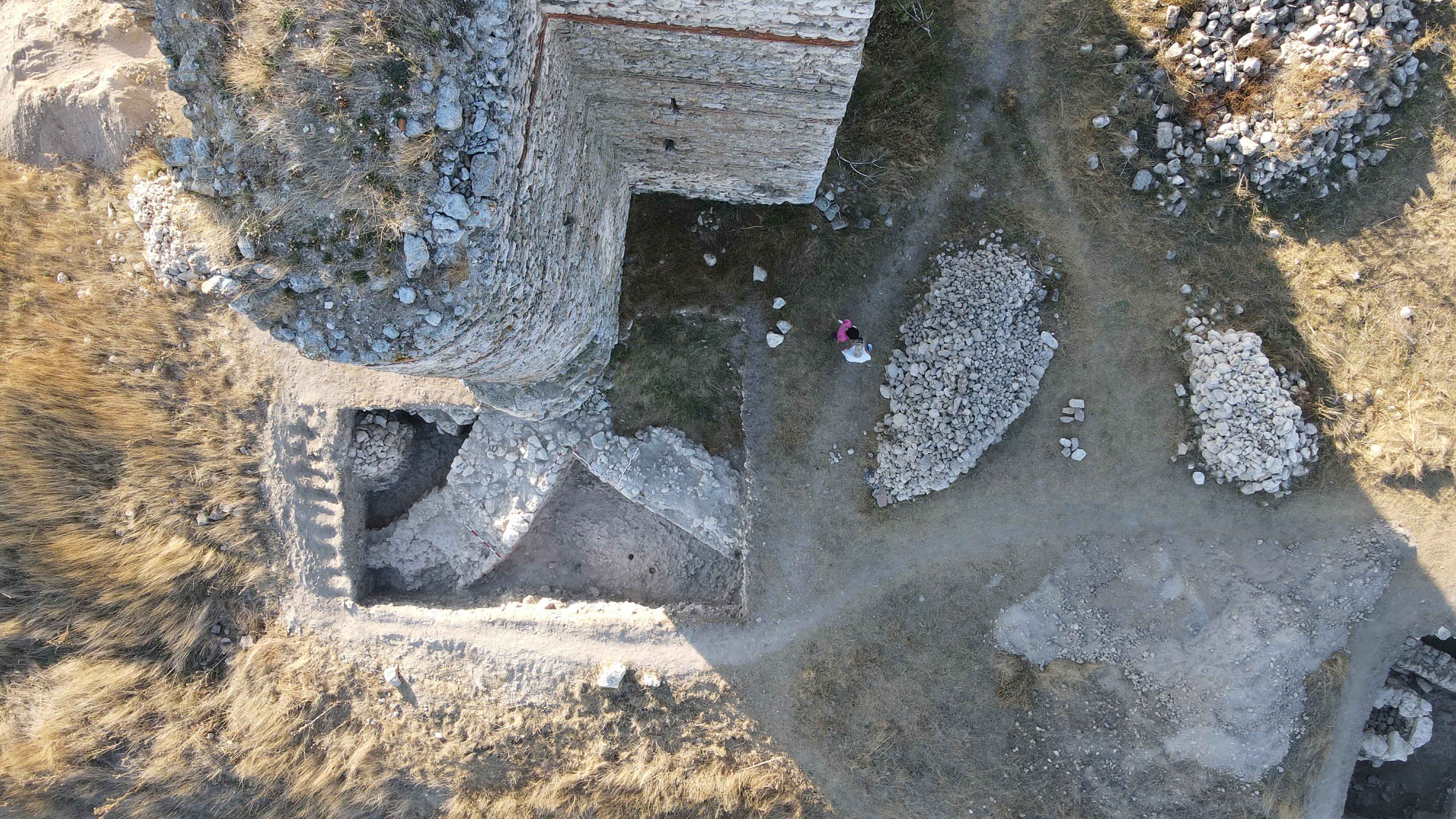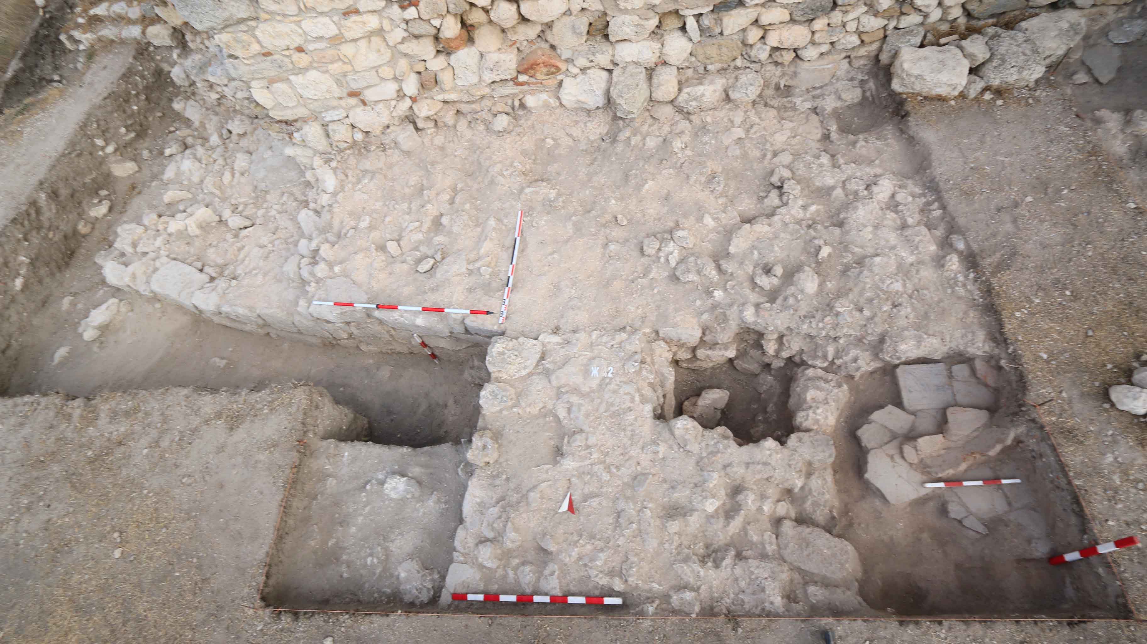 Трасето на късноантичната крепостна стена и средновековното ходово ниво от нивелирани цели и фрагментирани тухли.