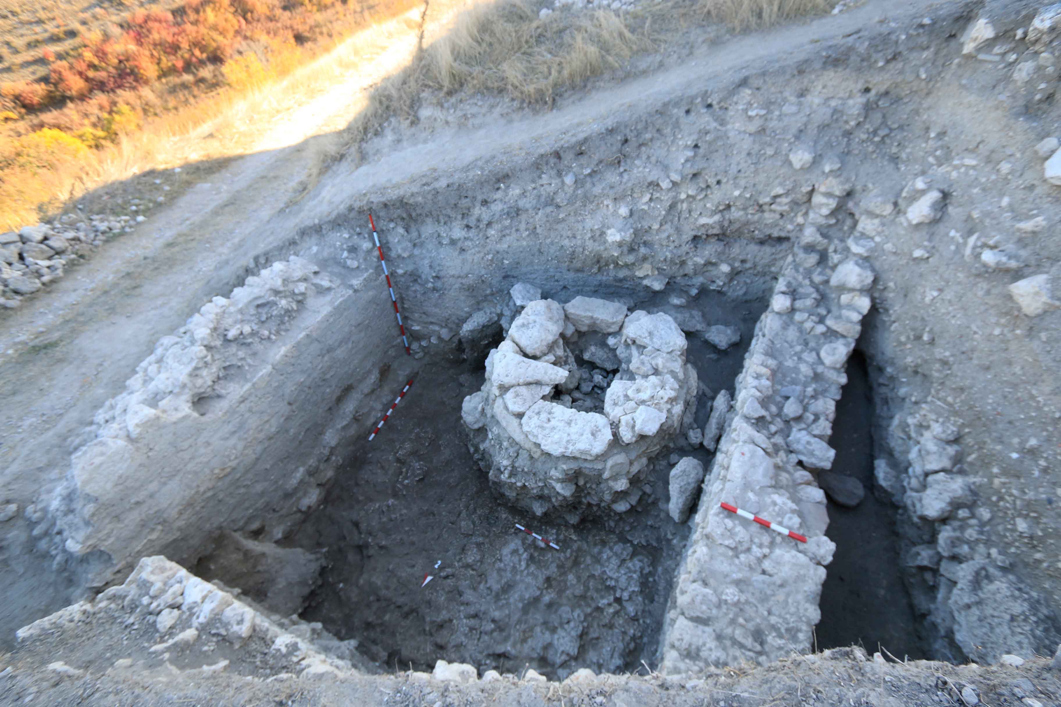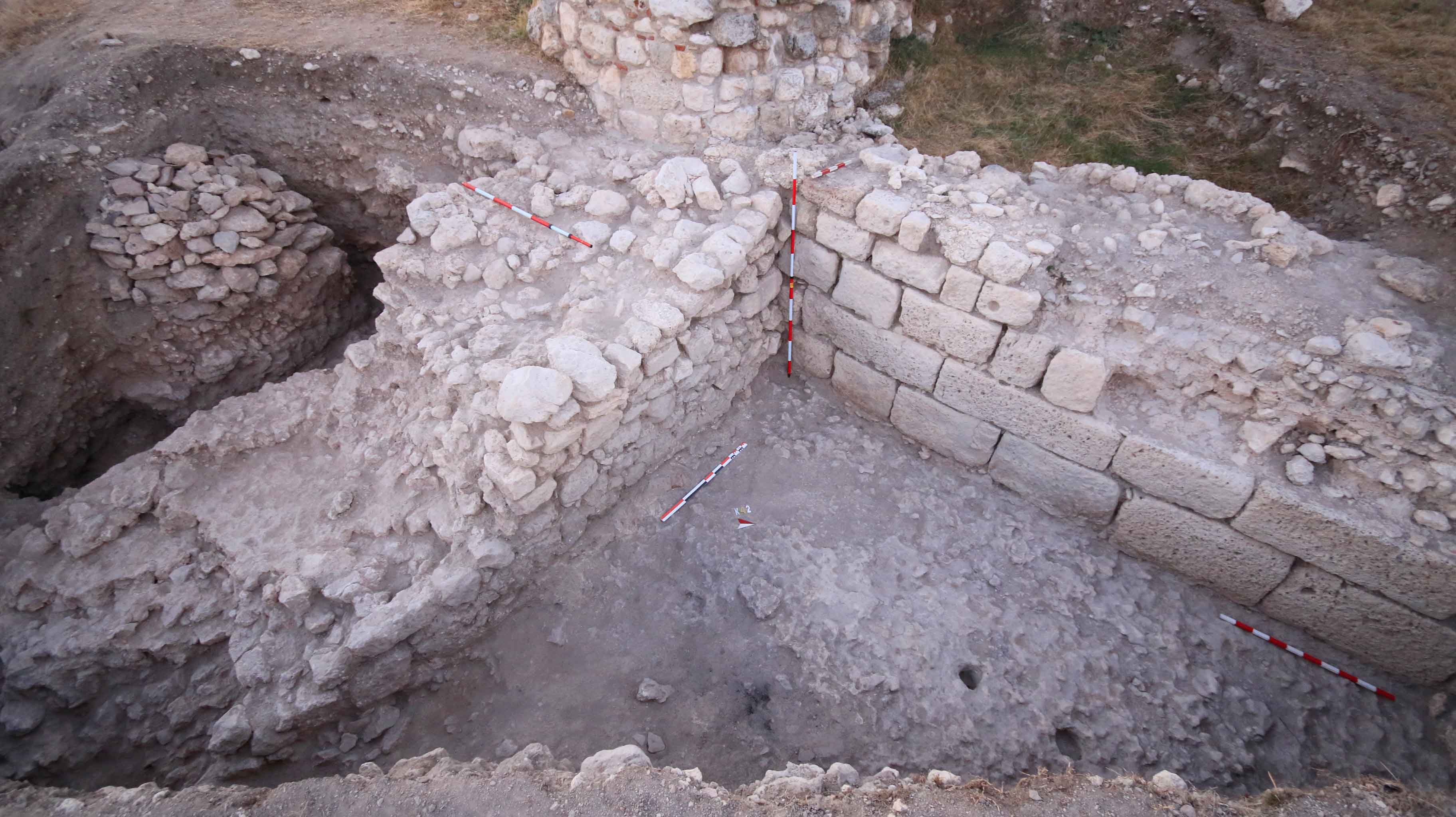 Кръгло каменно съоръжение, късноантичната крепостна стена и зид от късноантична постройка.