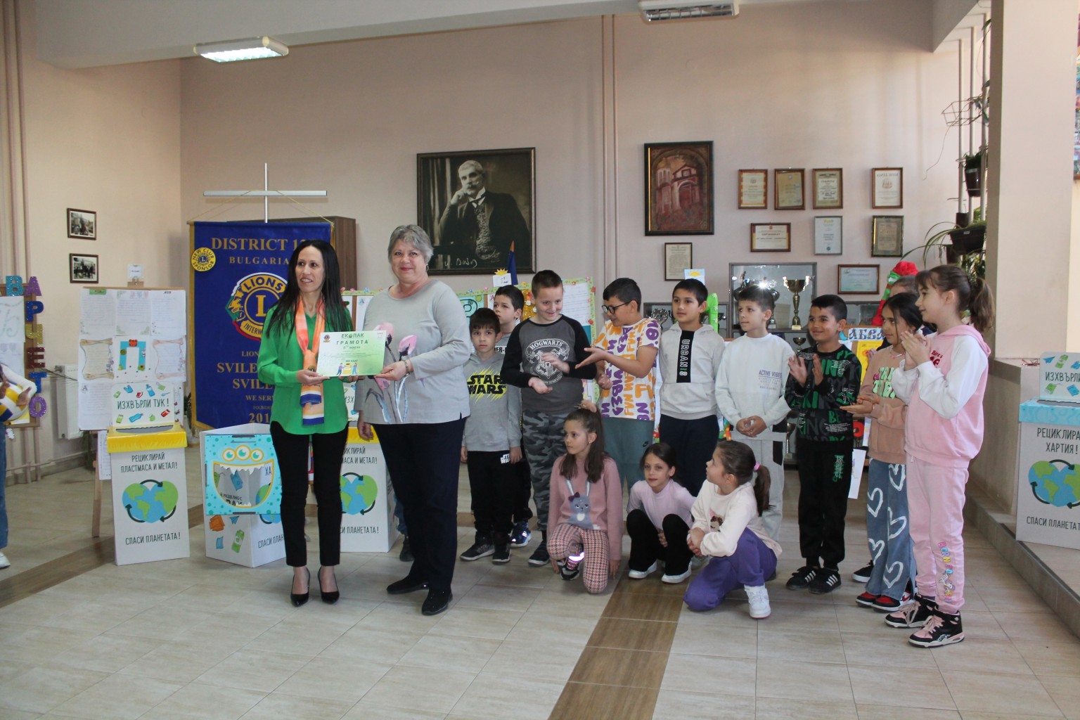 Кметът на община Свиленград арх. Анастас Карчев награди учениците от II б клас на Първо ОУ „Иван Вазов”. Децата станаха първенци в кампанията „ЕКОклас” за разделно събиране на отпадъци за ученици от 1 до 4 клас. Второкласниците спечелиха състезанието като събраха 61,150 кг рециклируеми пластмасови бутилки и алуминиеви кенчета. За труда си те бяха наградени с купата на победителя, грамота и волейболни, баскетболни и футболни топки. На второ място със събраните 48,650кг рециклируем отпадък се класира II а клас от Първо ОУ „Иван Вазов“, на трето място се наредиха децата от III б клас, СУ „Д-р Петър Берон“, които събраха 45,700 кг рециклируем отпадък. Техните награди – грамоти и различни спортни топки, връчи Христина Карчева – президент на Лайънс клуб „Свилена“ – Свиленград.
