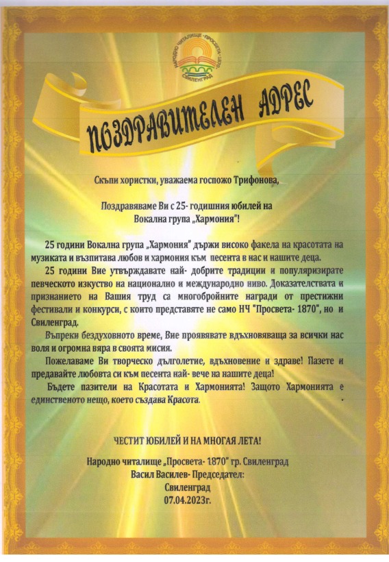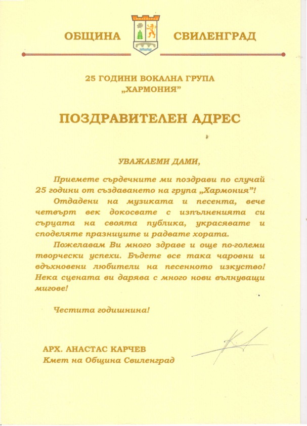 „Пожелавам Ви много здраве и още по-големи творчески успехи! Бъдете все така чаровни и вдъхновени любители на песенното изкуство!“ Това написа в Поздравителен адрес до Вокална група „Хармония“ кметът на Свиленград арх. Анастас Карчев, а поводът е 25-годишнината от създаването на групата.
