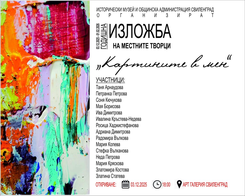 На 03.12.2025 г., от 18:00 часа, в арт галерия Свиленград – художествен отдел към Исторически музей, се открива годишна изложба на 15 местни творци, озаглавена „Картините в мен“.