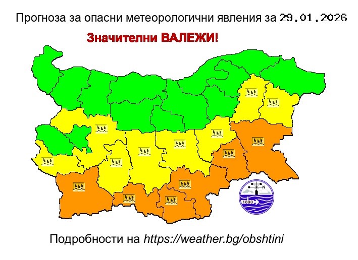 Очакват се интензивни валежи с прогнозни количества между 35 и 60 mm за денонощието.
